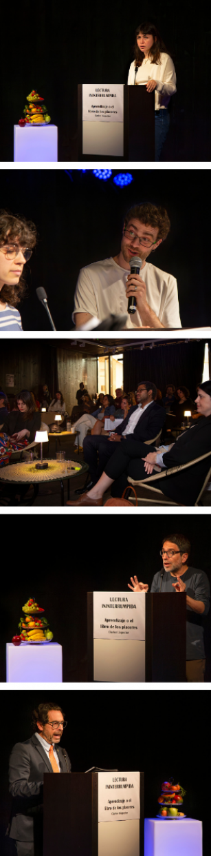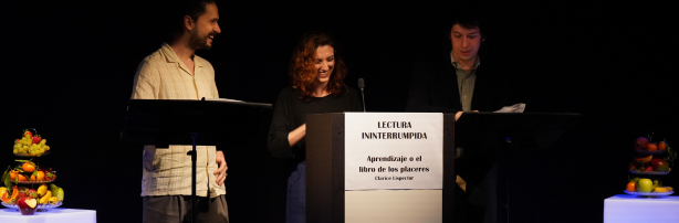 Un faristol al centre, pel qual anaven passant cada cinc minuts els lectors i les lectores, dues fruiteres disposades amb cura a cada lateral de l’escenari —en una d’elles, una poma vermella mossegada, símbol del despertar i del desig de la Lori, la protagonista de la novel·la—, l’intens i constant aroma d’un gessamí i el gust d’un suc de poma que donava la benvinguda als assistents, van crear una atmosfera que semblava suspesa fora del temps. La novel·la de Lispector ens parlava des de diferents llocs, la literatura es va convertir en experiència sensorial.