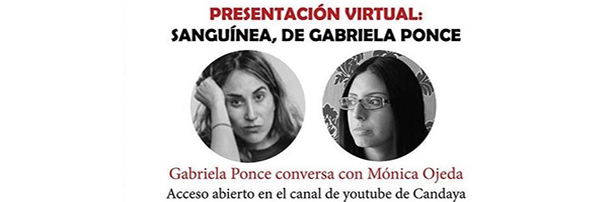 Casa Amèrica Catalunya es suma a la Gira Virtual Candaya. Una iniciativa que assaja noves formes perquè els lectors descobreixin i vagin a la trobada dels llibres que van ser colpejats i van quedar encallats per la pandèmia. Presentacions virtuals que sempre reuneixen a dos escriptors de Candaya i una llibreria per conversar al voltant dels llibres que es volen rescatar. En aquesta ocasió la cita és amb Sanguínea, novel·la de l'escriptora equatoriana Gabriela Ponce, qui dialogarà amb la també escriptora equatoriana Mónica Ojeda.