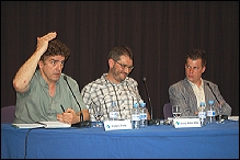 “El Mundial de Argentina 78 fue una farsa amañada”. Lo ha dicho en voz alta el periodista argentino Federico Winer, recogiendo la conclusión que flotaba en el ambiente del auditorio de Casa Amèrica Catalunya tras la proyección de documental “Mundial 78. Verdad o Mentira”, de Christian Rémoli. Ésta ha sido la primera ocasión que se ha podido ver en Europa, en una sala abierta al público en general, este documentado trabajo periodístico donde ex-futbolistas argentinos y peruanos que participaron en aquel Mundial reconocen abiertamente la existencia de sobornos y dopajes en beneficio de Argentina. La selección albiceleste logró coronarse entonces por vez primera campeona del mundo para entera satisfacción de la dictadura militar de Videla, en una demostración evidente de “cómo el deporte es utilizado por el poder”, ha subrayado el periodista Frederic Porta. “Mundial 78. Verdad o Mentira” también analiza el siniestro papel del almirante Carlos Lacoste, hombre fuerte de la organización del evento, y del técnico argentino César Luis Menotti. (En la imagen, de izquierda a derecha, Frederic Porta, Josep A. Vilar y Federico Winer, los tres periodistas que han participado en el debate posterior a la proyección del dcoumental