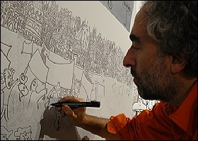 Hasta el próximo 23 de febrero puede verse en el Centro de Cultura Contemporánea de Barcelona (CCCB) la exposición “En Transición”, una propuesta de comprensión del complejo proceso de recuperación de las instituciones democráticas en España tras casi 40 años de dictadura franquista, desde los últimos años de vida del dictador hasta el fallido golpe de estado de 1982. El dibujante y humorista gráfico argentino, Miguel Rep, estuvo trabajando durante cuatro días en un mural de grandes dimensiones (5’5 x 2m.) instalado en el vestíbulo del CCCB, entre el 3 y el 6 de febrero, en interacción con el público de la muestra. También participó en la mesa redonda dedicada a “El humor como arma política” junto a los dibujantes españoles Forges y Toni Batllori.